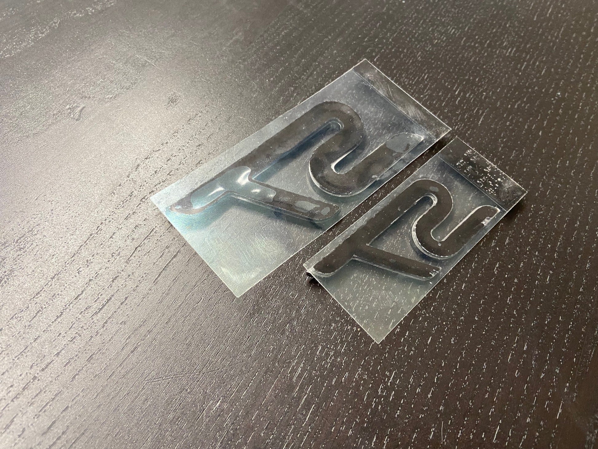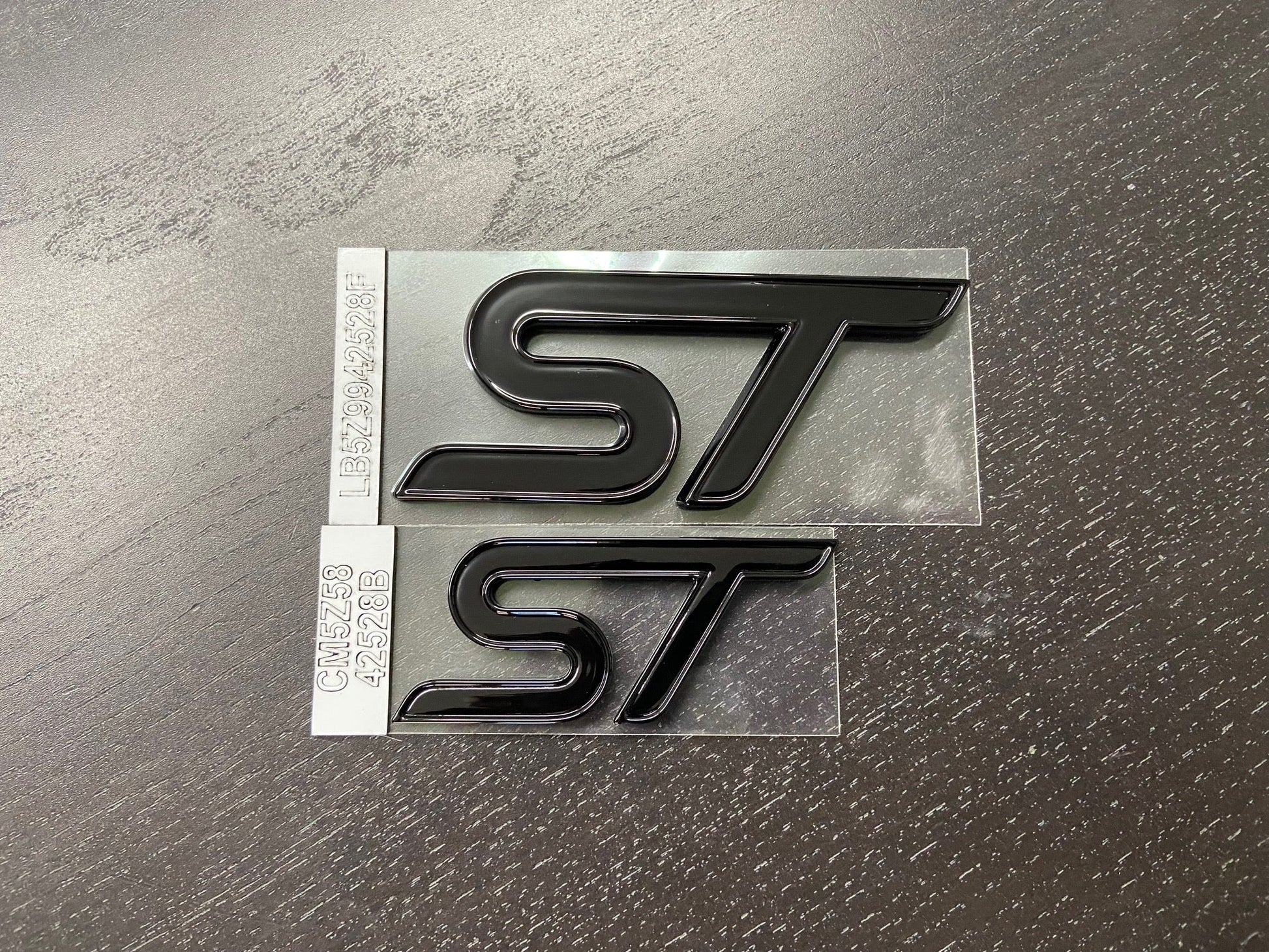 Front and rear "ST"s emblems, new and ready to install with replaced laser cut adhesives already installed.