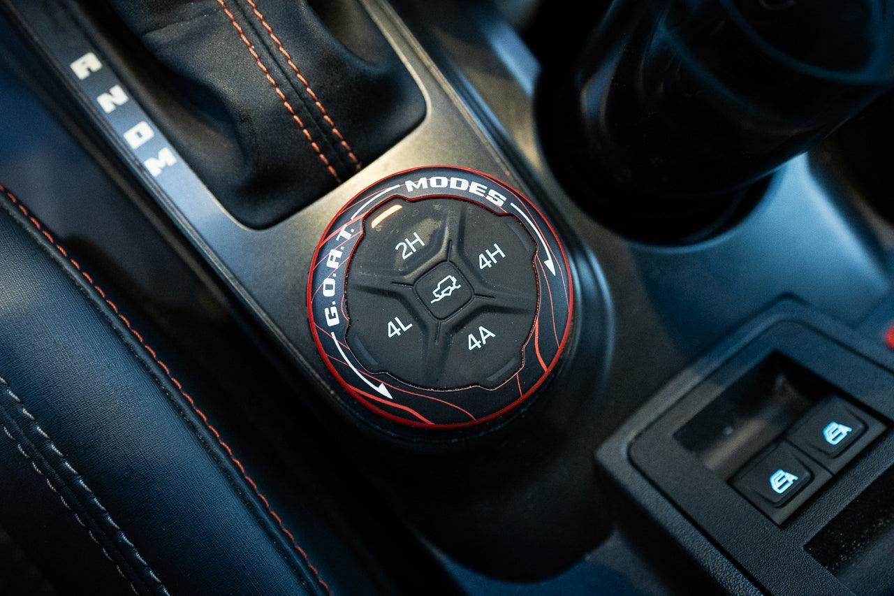 These GOAT mode overlays are designed to match the theme of our other interior overlays. The GOAT Mode lettering is in white which provides high visibility versus the OEM lettering.